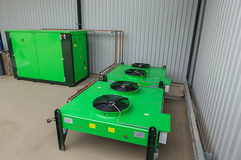 As a result of changes to EU legislation which further limit the use of synthetic refrigerants, new cooling systems using coolants such as propane-CO2 have become an attractive alternative. In addition to the effective cooling properties of CO2, the added benefits of this refrigerant are its safety and environmentally friendly characteristics. The temperature of the air cooler can also be controlled in these systems, so they can be accurately geared to the stored product. This keeps drying-out to a minimum (in other words – more and better products come out of storage) and energy consumption is also reduced. It is likely that CO2 propane storage installations will become standard in future, thanks to their environment-friendly properties.