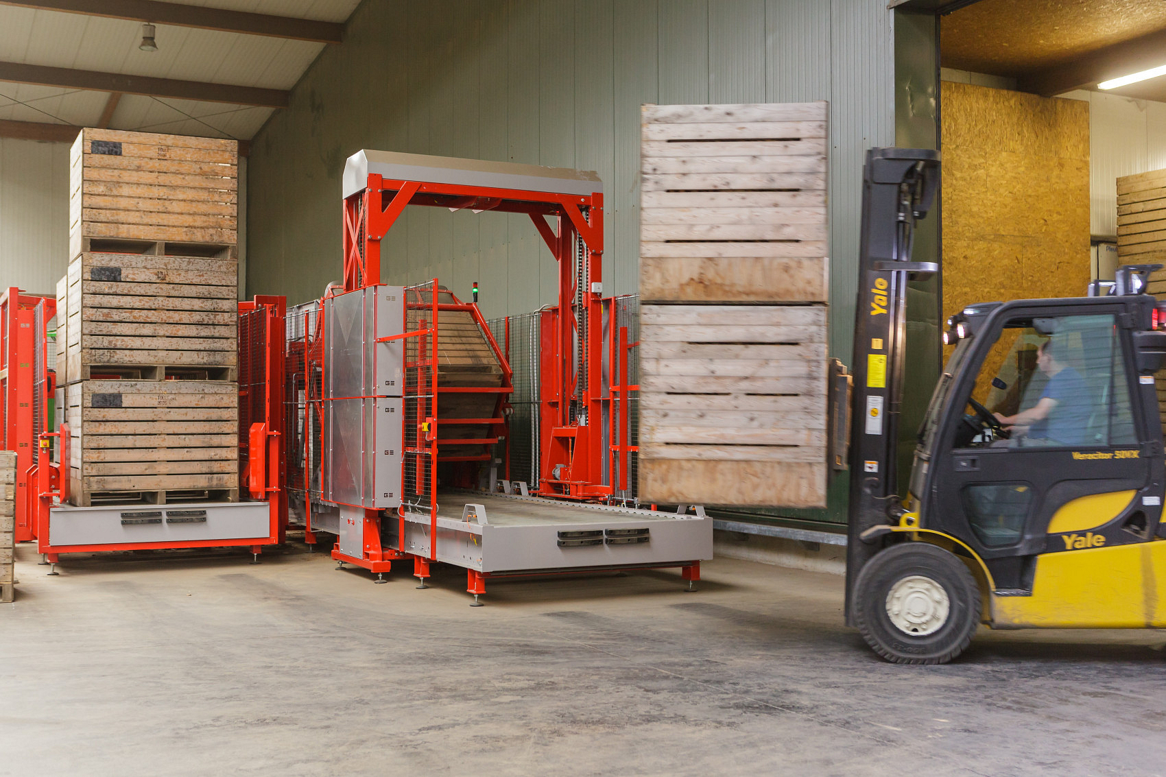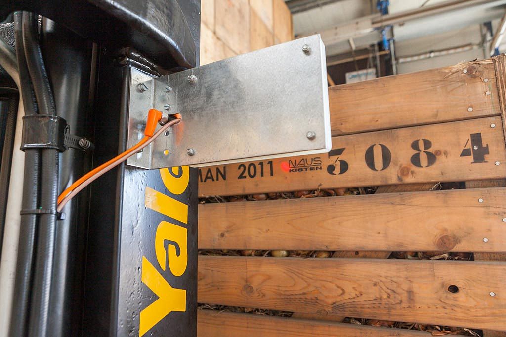 Every box gets fitted with an electronic TAG. The scanner mounted on the forklift recognizes the box. The terminal mounted on the forklift connects the box-content tot the number of the box and communicates this with a (WiFi) server. In this system, the rows and stacks of boxes are pre-determined. In this way, the overview of boxes in the storage is always actual.