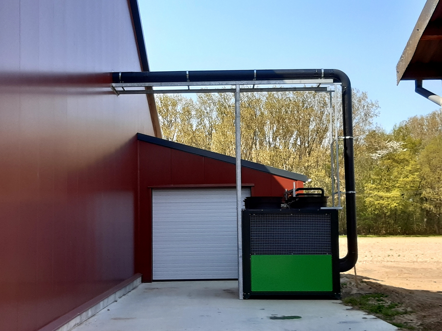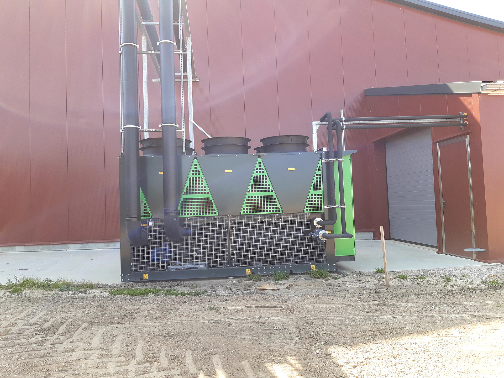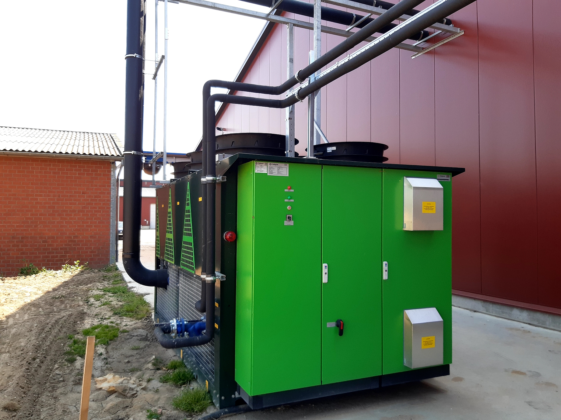 Indirektes System mit Wärmetauscher, aufgefüllt mit Glykol Kälteträger. Zentrale Kühlanlage bestehend aus 1 Chiller-Aggregat mit Hydroeinheit, luftgekühltem Verflüssiger, Schaltschrank und Luftkühler, diese Komponenten werden in einen Satz montiert.