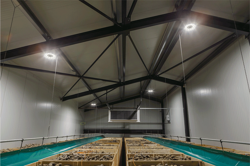 En plus de la bonne température et de l'humidité qui garantissent la qualité des pommes de terre stockées, la lumière joue également un rôle à cet égard. Sous l'influence de la lumière blanche, une pomme de terre peut devenir verte en raison de l'accumulation de solanine et de chlorophylle. Pendant la période de stockage, le luminaire LED peut être commuté du blanc au vert afin d'éviter la décoloration verte des pommes de terre.