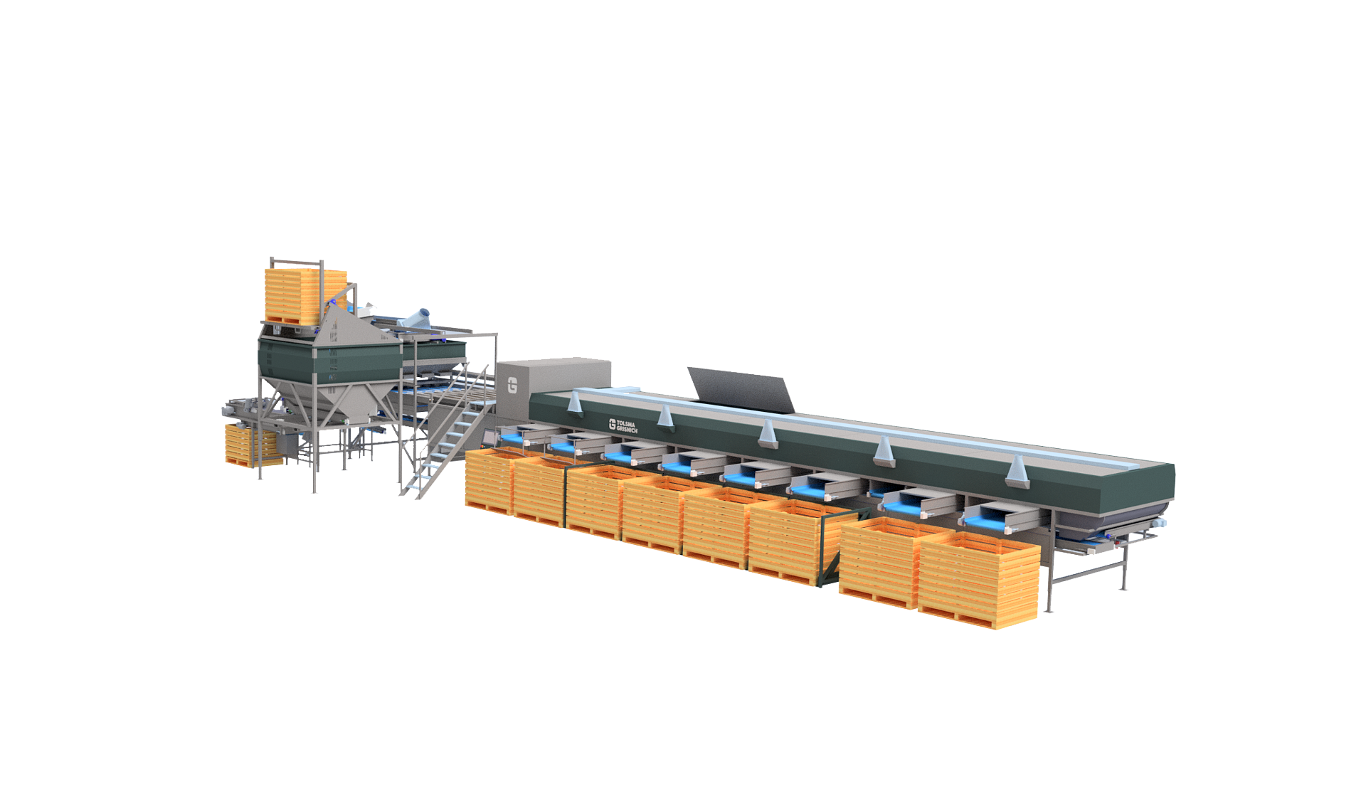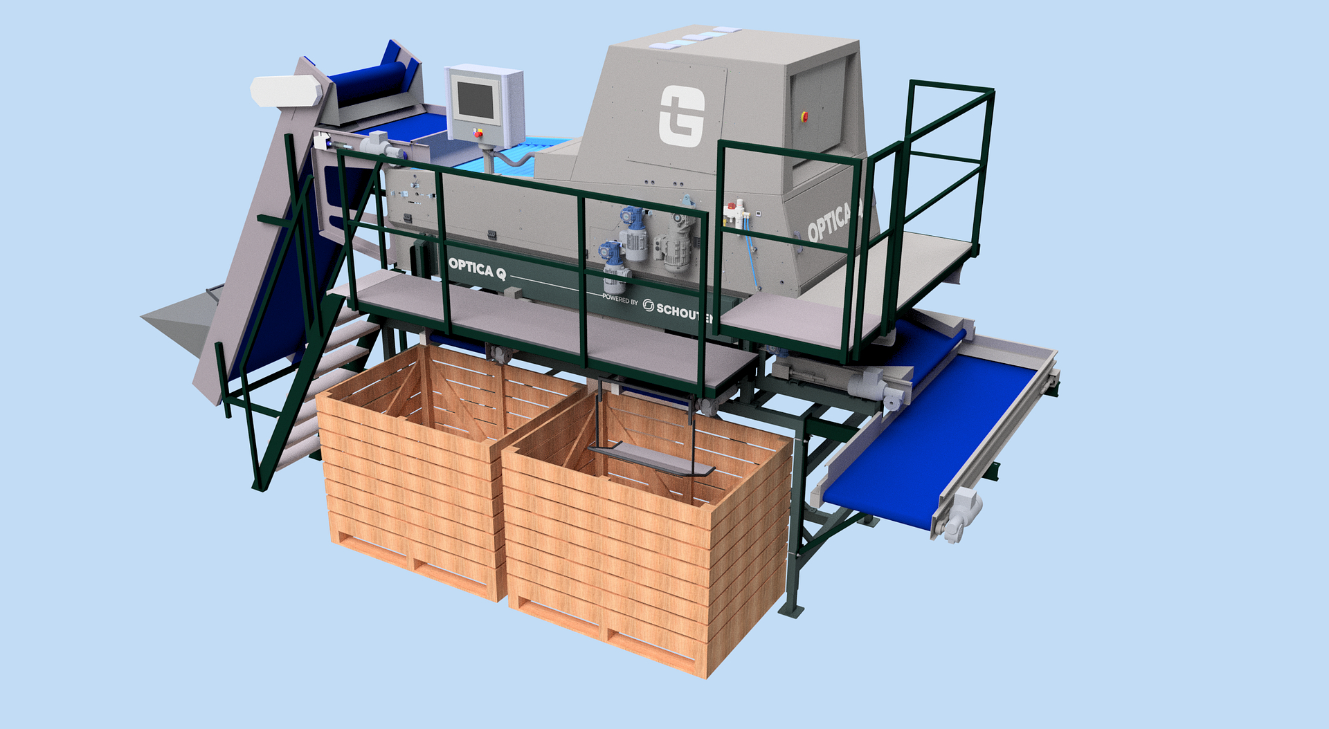 De Optica Q kan gecombineerd worden in een verwerkingslijn met schudsorteerders of met de optische maatsorteerder Optica CS.