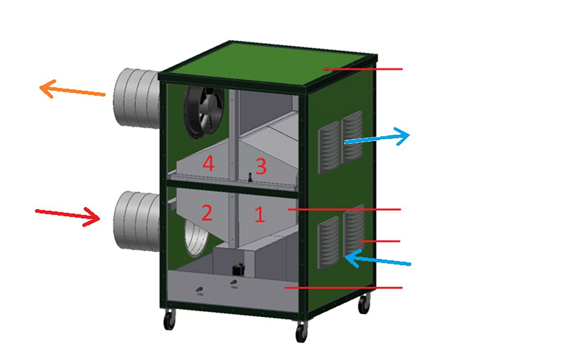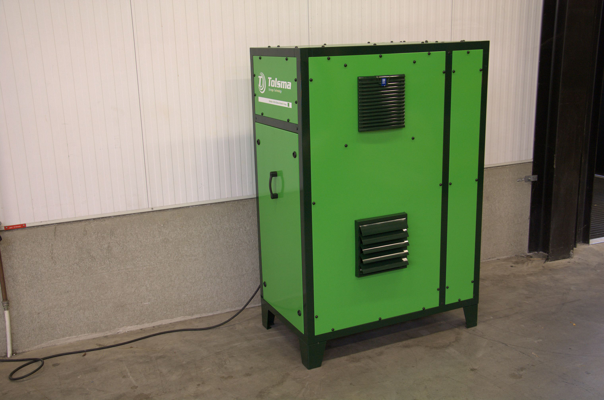 The Fresh Box saves energy and prevents heat and moisture coming into the storage in warm periods and climates. The Fresh Box controls, that warm fresh air that comes into the storage, is cooled down through a heat recovery unit and the CO₂ is removed outside, all fully-automatic. Additional cooling down is done by evaporation of water in the heat recovery unit. With the Tolsma Fresh Box, the air is refreshed with minimal power consumption and minimal temperature differences in the storage are ensured.