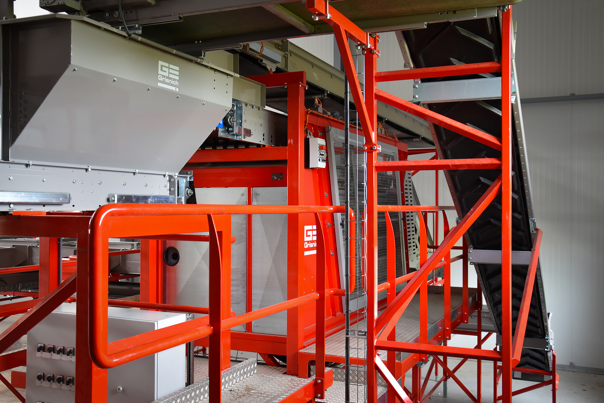 In recent years, Leber’s company has grown considerably in size. As a result, he is now growing more seed potatoes. In order to be able to store them all after the harvest, he has decided to build a new shed with 4 compartments, suitable for seed potatoes which are stored in cubic boxes. In order to keep the climate optimal in the box storage, he opted for a blow-suction ventilation system from Tolsma-Grisnich with a concrete airlock. This combined wall can blow air through the pallet, but also suck air past the boxes. The revolutionary ACM fans are used for the ventilation system. And because Leber will be sorting his seed potatoes in the winter, he was also looking for a solution for a larger sorting capacity. “During the conversations about ventilation and climate control with Tolsma-Grisnich, the wishes for a different sorting line quickly became apparent. That’s how the ball started rolling and we finally opted for a new Grisnich processing line.” In addition to several conveyor belts, platforms and the shear belt with 5 discharge funnels, the MV09 sorter is used. This sorter is unique because each sorting deck is driven by its own eccentric. The MV09 has a capacity of 20 tons per hour.