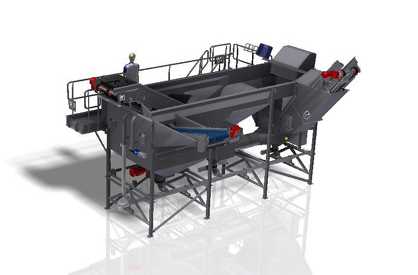An internal pump system, based on a propelling screw creates a simple and precise adjustable upwards stream. This allows for an optimal separation per desired situation. The machine is automatically controlled using high-end control components. The product flow is evenly supplied and put into a seperation bath. The upward stream in the bath will push the product upward, whereas stones and clods will sink to the bottom and will be removed. The product and floating parts will float over the to the extraction conveyer (product conveyer) and the remaining floating particles will be driven to the haulm conveyer. After the seperation of stones, clods and haulm, the batch can be further processed.